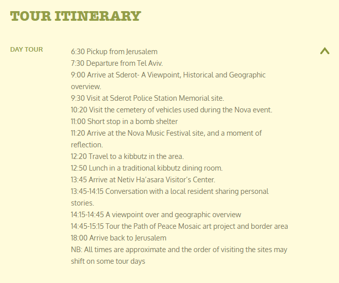 Son tours organizados por agencias como Abraham Tours y otras. Lo llaman «turismo experiencial», «turismo de guerra» o, como algunos lo han bautizado, «el tour del horror». La mayoría de los visitantes son israelíes que buscan una especie de venganza, brindan por los soldados de las FDI, observan el humo de las bombas y escuchan las explosiones de los proyectiles a unos 10 kilómetros de distancia.