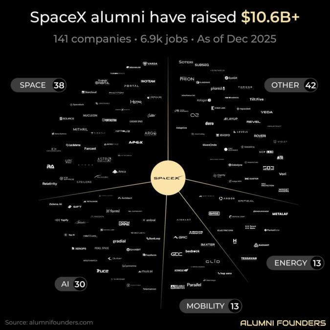 En total, las nuevas empresas formadas por ex alumnos de SpaceX (en los sectores de tecnología espacial, inteligencia artificial, energía, movilidad y otros) han recaudado 10.600 millones de dólares hasta la fecha y han creado más de 7.000 nuevos puestos de trabajo.