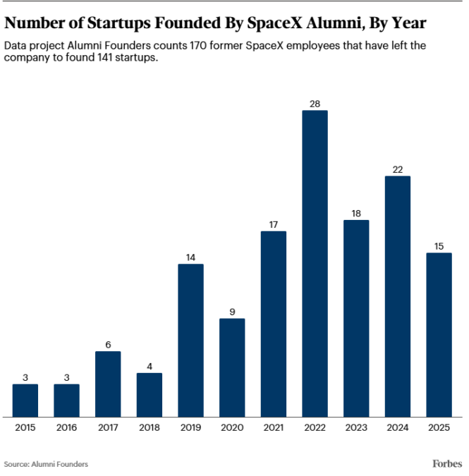 Eso no es inusual para una empresa de la estatura de SpaceX. El número de exalumnos de SpaceX es solo una fracción de los fundadores que anteriormente trabajaron en gigantes del software como Google, cuyos exalumnos han fundado más de 2000 empresas emergentes, o Meta, con más de 800 empresas emergentes de exalumnos, según estimaciones de Crunchbase. (La base de datos de VC, que genera automáticamente estas estimaciones basándose en perfiles de empresas registrados automática y manualmente en su sitio, estima que el recuento de empresas emergentes de exalumnos de SpaceX está más cerca de 60). El recuento de exalumnos de SpaceX coincide con las estimaciones de las 160 empresas emergentes de exalumnos de la NASA y las 150 empresas emergentes de exalumnos de Tesla. Nueve empresas emergentes fundadas por exalumnos de Tesla se han convertido en unicornios, según el profesor de negocios de Stanford Ilya Strebulaev.