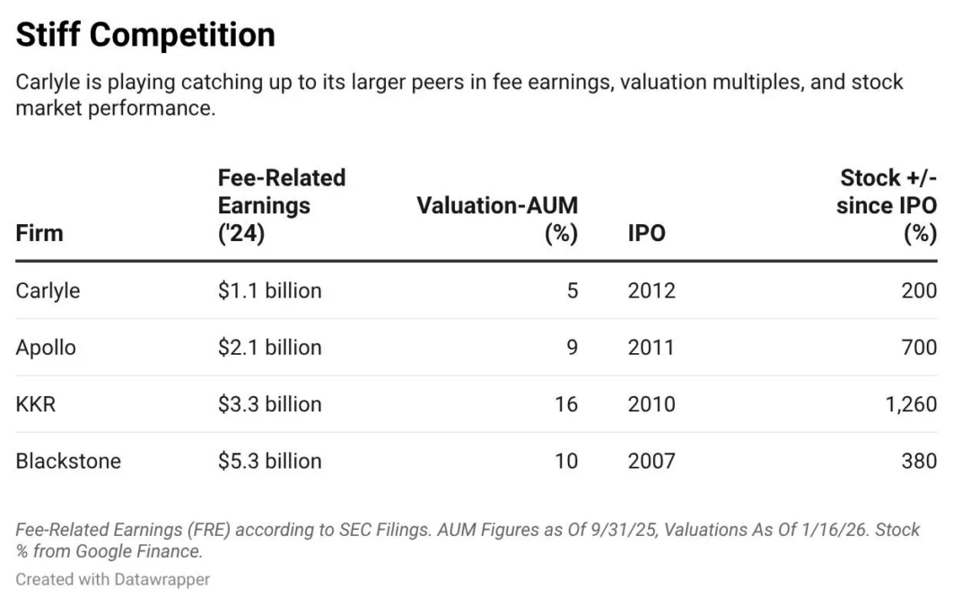 Hasta el momento, los accionistas están satisfechos con el nuevo impulso de Carlyle. Desde que Schwartz asumió el control en febrero de 2023, la acción casi se ha duplicado, con una rentabilidad del 90%, y finalmente empieza a seguir el ritmo de competidores como Blackstone, KKR y Apollo. Sin embargo, en métricas clave de rendimiento, como las ganancias y los márgenes de comisiones, Carlyle aún se encuentra por detrás de sus competidores. Su valoración bursátil de 24.000 millones de dólares, medida como porcentaje de sus 474.000 millones de dólares en activos de inversión, cotiza con un descuento significativo.