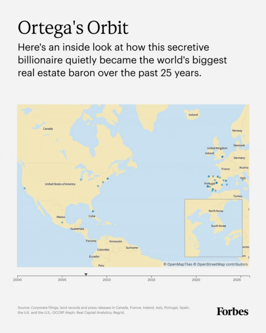Forbes analizó minuciosamente documentos corporativos, registros de tierras y comunicados de prensa en nueve países, además de datos de las bases de datos inmobiliarias Regrid y Real Capital Analytics, para reconstruir el imperio inmobiliario de Ortega. Su valor se estima en 25 mil millones de dólares y abarca más de 200 propiedades en 13 países. Esto lo convierte en el magnate inmobiliario más importante del mundo, con una cartera más valiosa que la de los promotores inmobiliarios más exitosos: el australiano Harry Triguboff (23.200 millones de dólares) y el estadounidense Donald Bren (19.200 millones de dólares).