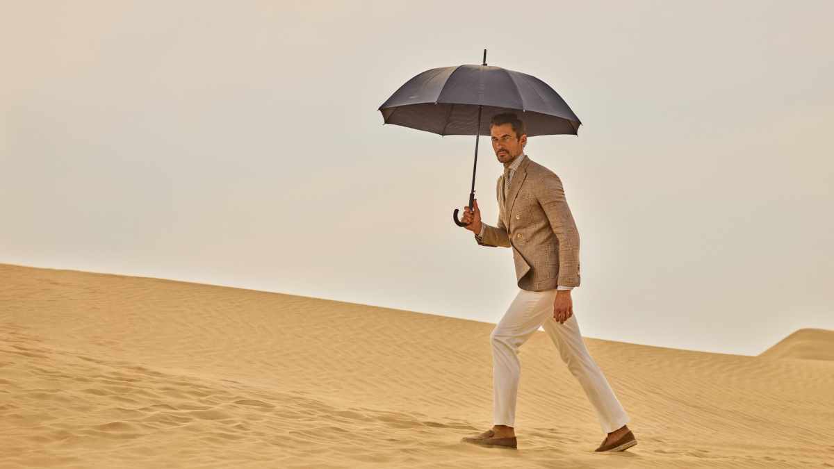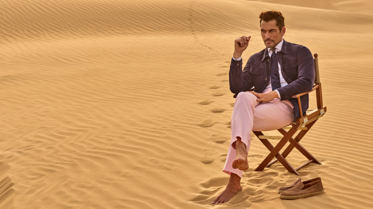 La línea Hackett Nº14 Savile Row atraviesa la propuesta con chaquetas tipo caban, pantalones de caída fluida y blazers de construcción flexible que equilibran estructura y comodidad. Incluso la paleta cromática —azules marinos y costeros combinados con terracotas, verdes y matices empolvados— dialoga con el paisaje desértico y refuerza esa sensación de continuidad entre entorno y vestuario.