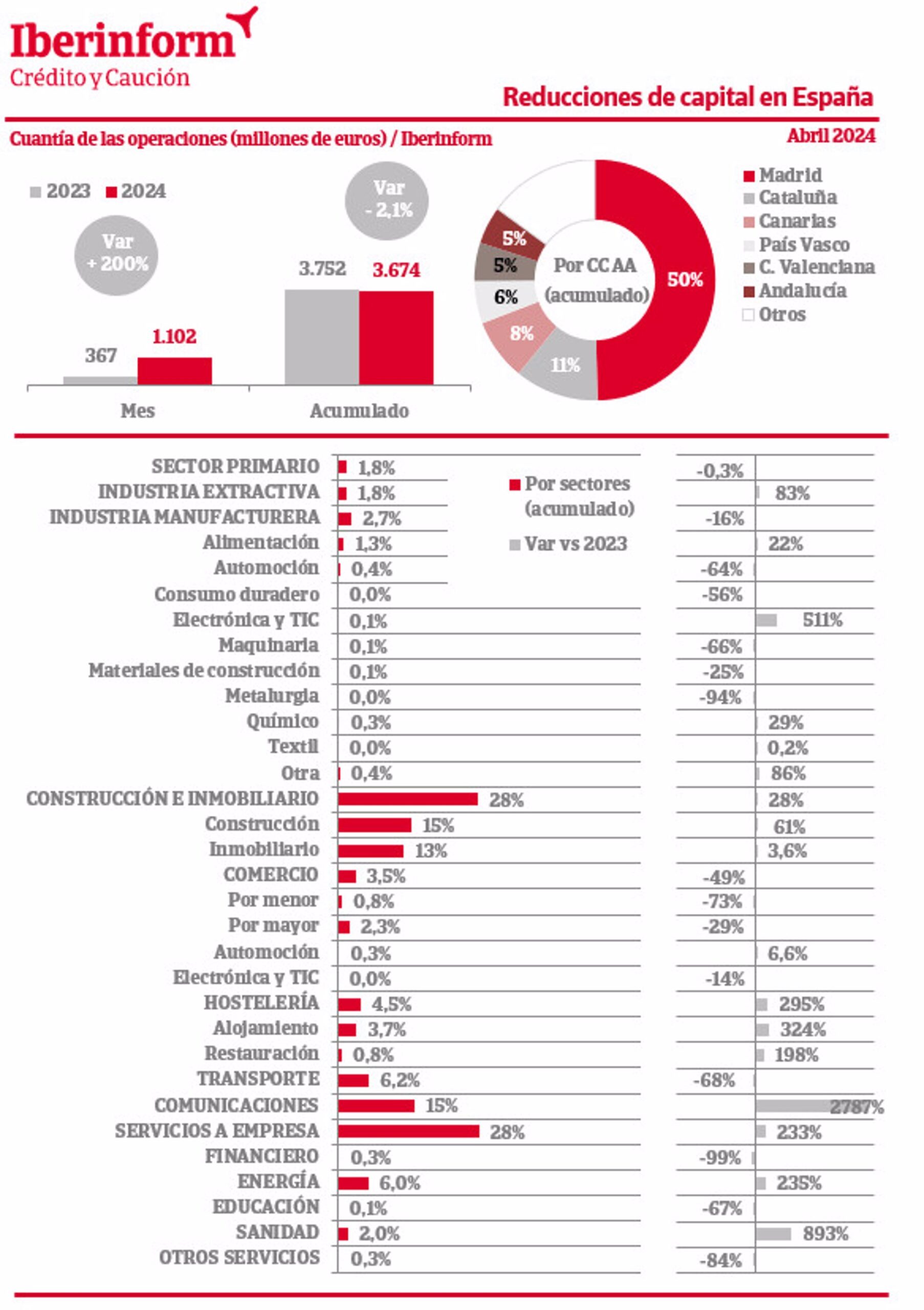 Pese a la caída en el importe total, el número de reducciones de capital en el tejido empresarial registró en abril una aumento interanual del 35%. Tan solo en el mes de abril la cuantía de las reducciones fue de 1.102 millones de euros, un 200% más que en abril de 2023 (367 millones).