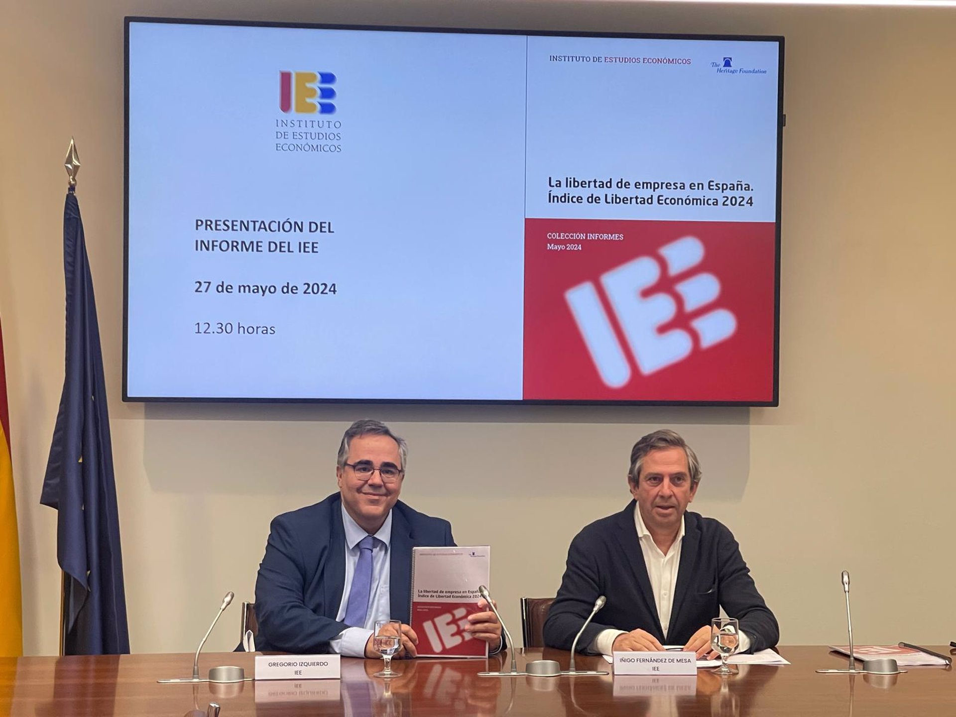 El presidente del Instituto de Estudios Económicos, Íñigo Fernández de Mesa, y su director general, Gregorio Izquierdo, han presentado este lunes el informe del IEE ‘La libertad de empresa en España. Índice de Libertad Económica 2024’, donde se recogen los resultados de dicho índice, elaborado por la fundación Heritage, y adaptado al español por el Instituto de Estudios Económicos.