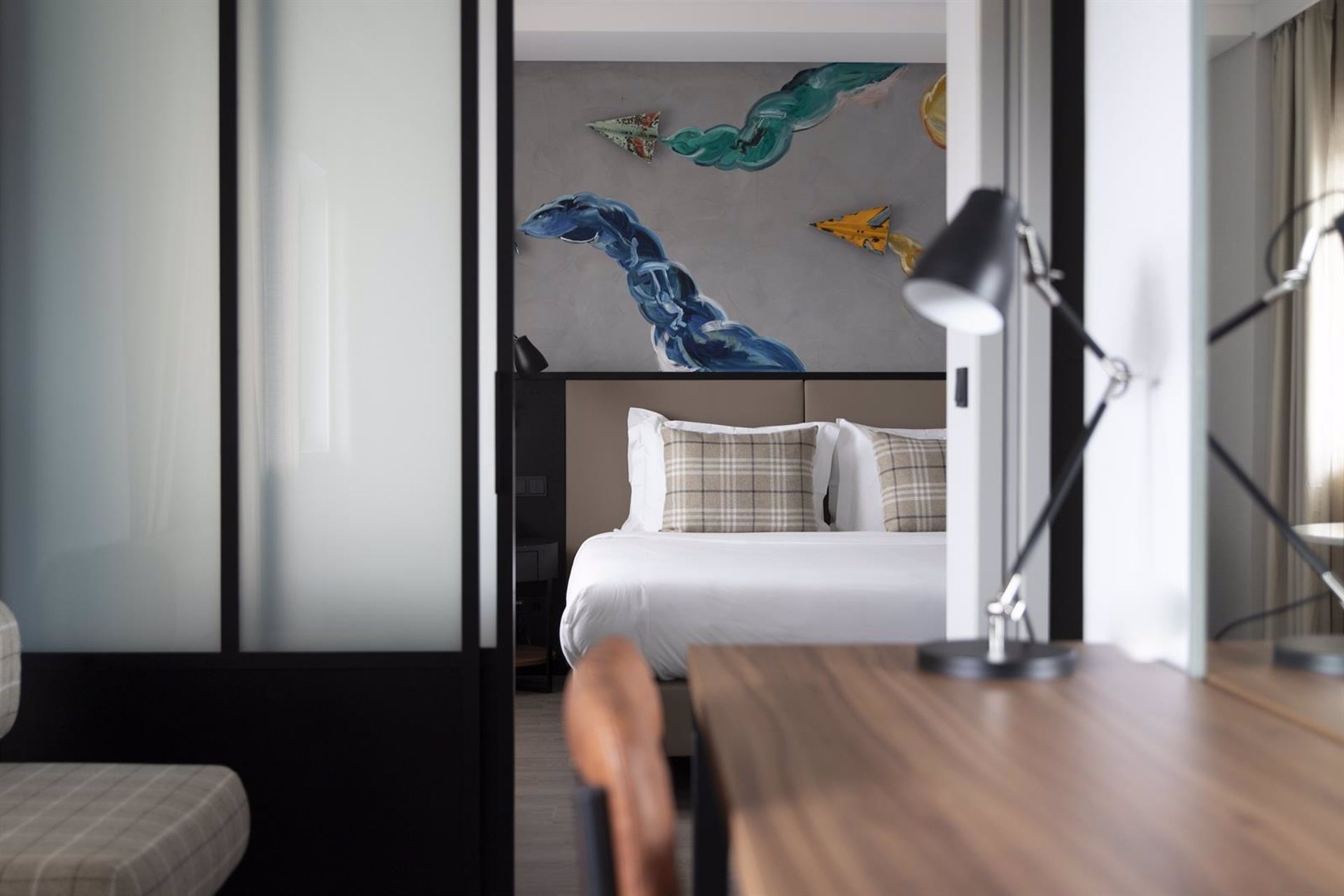 Entre todos ellos rinden un homenaje a la ciudad de Lisboa. El hotel es una auténtica galería de arte para disfrute de clientes y visitantes. La paleta de colores y materiales para los distintos ambientes están tomados de la industria aeronáutica y navegan entre los tonos metálicos grises, ferrosos, negros.