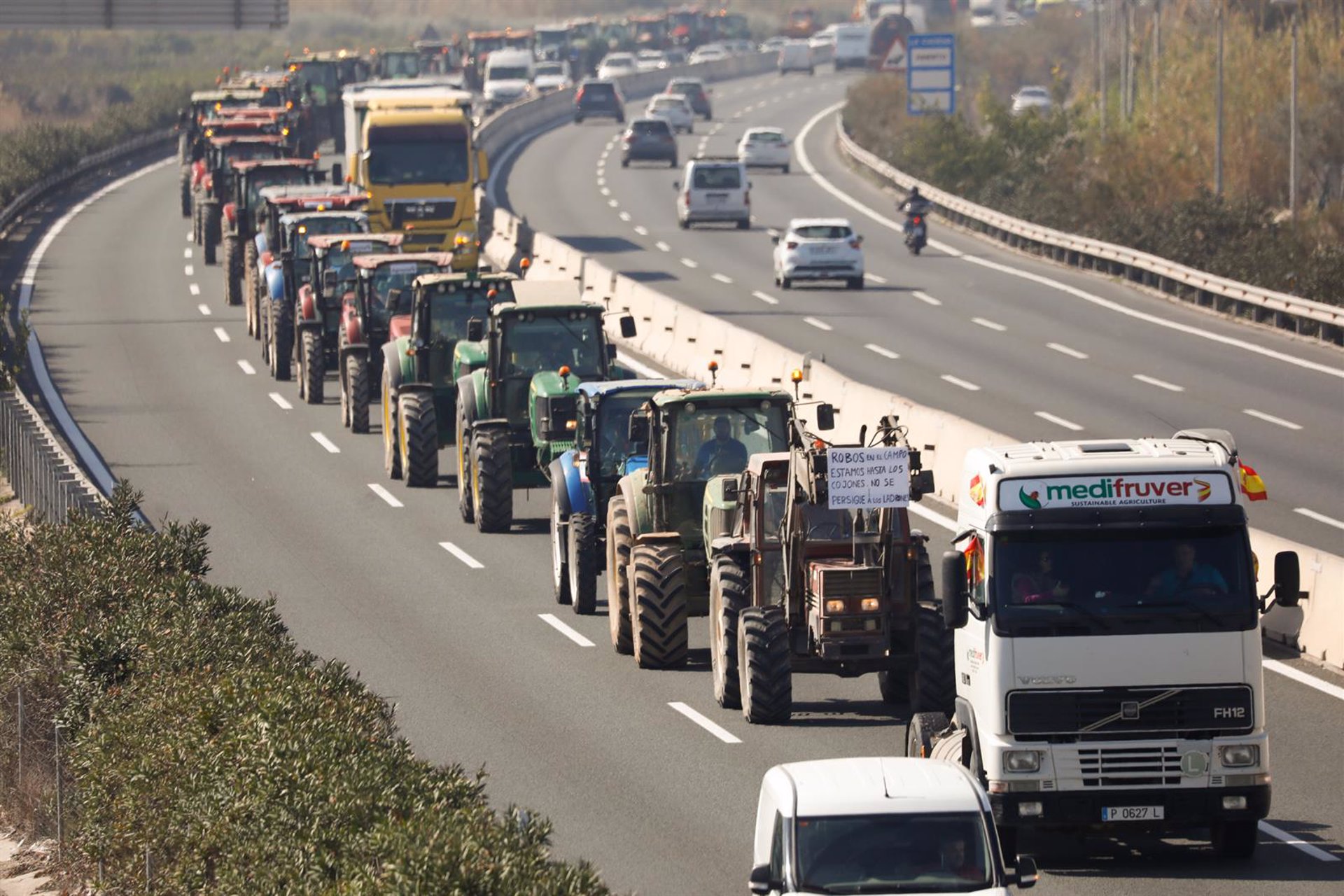 Las movilizaciones agrarias llevadas cabo durante el mes de febrero mantuvo bloqueado el tránsito en la práctica totalidad de las vías principales que discurren en el centro de la península, así como las que discurren por el Mediterráneo y parte de la cornisa cantábrica, impidiendo el transporte de unos 5 millones de toneladas de mercancías a la semana.
