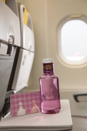 Como parte del programa Gotas de Solidaridad, impulsado por Solán de Cabras, la aerolínea entregará a la salida de varios vuelos de corto y medio radio botellas rosas de agua mineral.