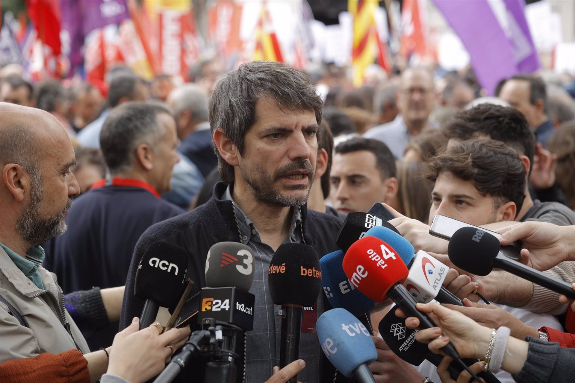 En declaraciones durante la manifestación de UGT y CC.OO. por el 1 de Mayo en Barcelona, ha asegurado que Sumar y Comuns tienen una posición clara: «No vamos a permitir que se cuestione el despliegue de las energías renovables», porque generan ganancias competitivas, menos costes energéticos y energía limpia.