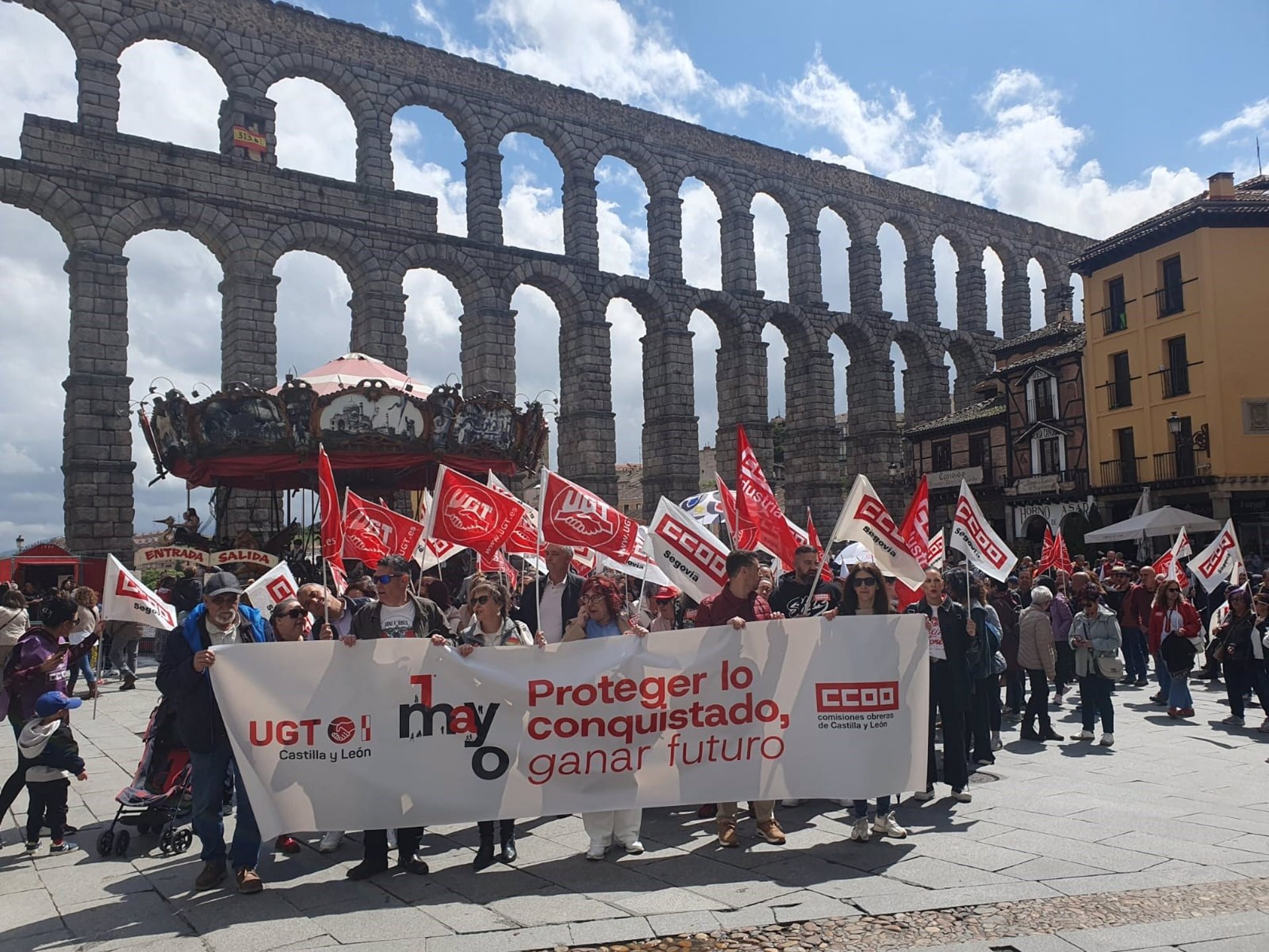 En Segovia unas 250 personas han acudido a la convocatoria de la manifestación sindical que ha iniciado su marcha desde el edificio de Sindicatos, en la Avenida del Acueducto, hasta alcanzar la plaza del Azoguejo y subir por la Calle Real a la Plaza Mayor.
