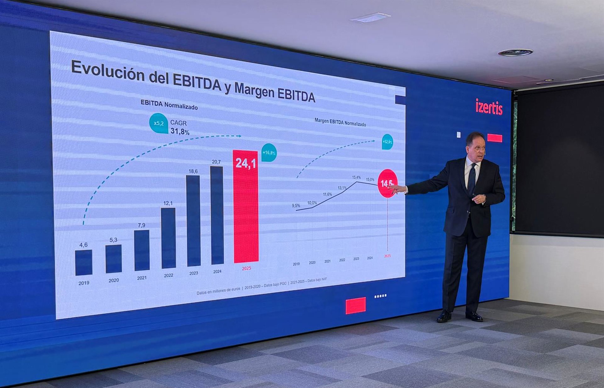 Martín ha aplaudido que Izertis está de aniversario, pues la firma cumple este año 30 ejercicios. «Es algo realmente importante que una compañía logre estar 30 años ejecutando un plan de negocio y cumpliendo año tras año con todos esos objetivos, creciendo ininterrumpidamente», ha celebrado este miércoles el ejecutivo en la presentación de los resultados de la firma, que obtuvo un beneficio de actividades continuadas de 4,45 millones de euros en 2025, un 1,8% más que un año antes.