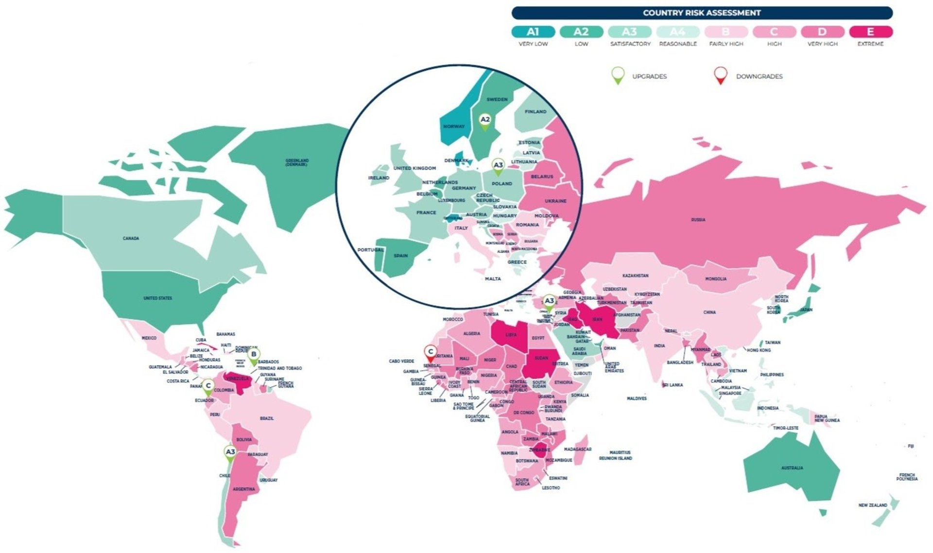 Para ello, los expertos de Coface han establecido ocho niveles, siendo A1 «muy bajo» (países con menos riesgo), A2 «bajo», A3 «satisfactorio», A4 «razonable», B «razonablemente alto», C «alto», D «muy alto» y E «extremo» (países con más riesgo).