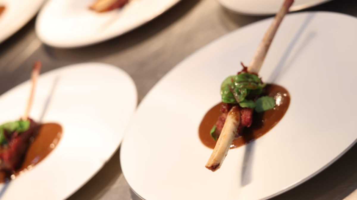 El corazón del menú fue Diario de caza, una declaración de identidad que incluía jabalí con especias y liebre a la Royal, uno de los platos más emblemáticos de la cocina cinegética reinterpretado desde la elegancia.
