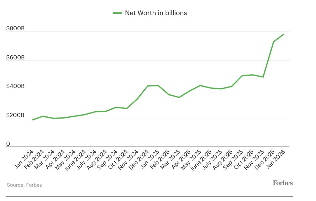 Musk ya ha alcanzado varios hitos en cuanto a su patrimonio neto durante el último año. En octubre, se convirtió en la primera persona en alcanzar los 500.000 millones de dólares, después de que el precio de las acciones de Tesla casi se duplicara en los cinco meses siguientes al anuncio de Musk de que dejaría su cargo como jefe del Departamento de Eficiencia Gubernamental (DOGE) del presidente Trump para dedicar más tiempo al fabricante de vehículos eléctricos. Luego, el 15 de diciembre, Musk se convirtió en la primera persona en alcanzar los 600.000 millones de dólares, después de que inversores privados valoraran su empresa fabricante de cohetes SpaceX en 800.000 millones de dólares, frente a los 400.000 millones de agosto. Cuatro días después, Musk se convirtió en la primera persona en alcanzar los 700.000 millones de dólares, después de que el Tribunal Supremo de Delaware anulara una sentencia de un tribunal inferior que había invalidado una concesión de opciones sobre acciones de Tesla, ahora valoradas en 126.000 millones de dólares, a Musk.