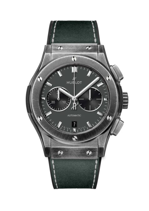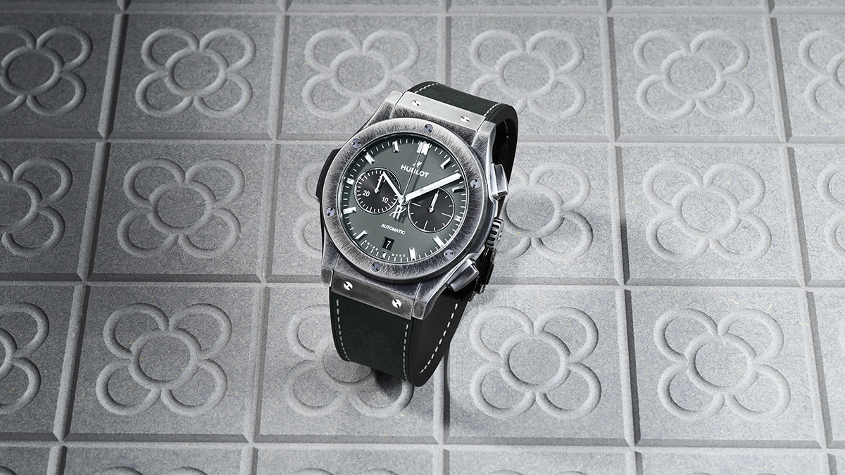 Si bien es un reloj muy diferente al que se ideó para Madrid (aquel, de tres agujas con fecha, mezclaba cerámica negra con toques de oro amarillo y el caucho de la correa), ambos comparten el “arte de la fusión” que ha hecho célebre a Hublot. El Classic Fusion Chronograph Barcelona Boutique es un ejemplar deportivo con una caja de titanio robusta, hermética hasta 50 metros, que mide 42 mm de diámetro y 11,9 de grosor. Su atípico aspecto industrial, ennegrecido y envejecido se logra recubriendo el titanio con PVD y luego realizando un cepillado para eliminar prácticamente toda esa capa.