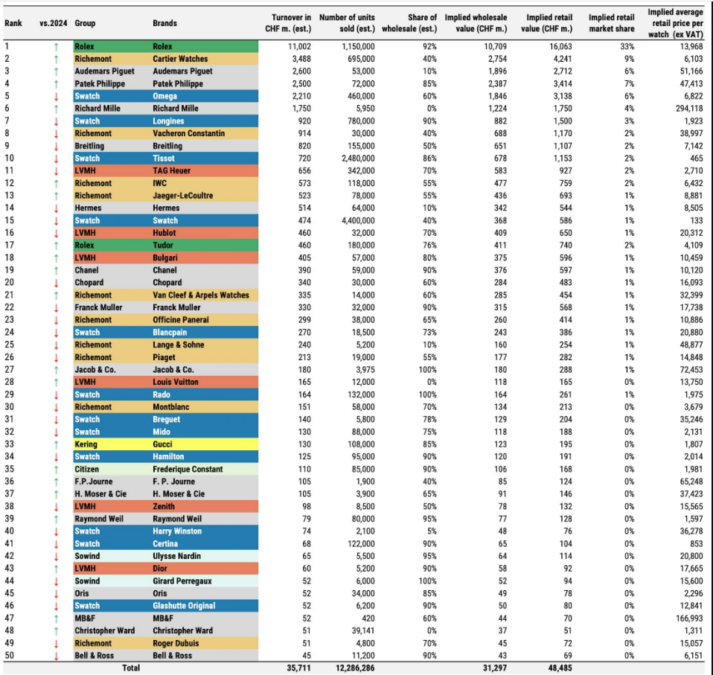 - Rolex: 11.002 millones de francos suizos (10.583 millones en 2024).