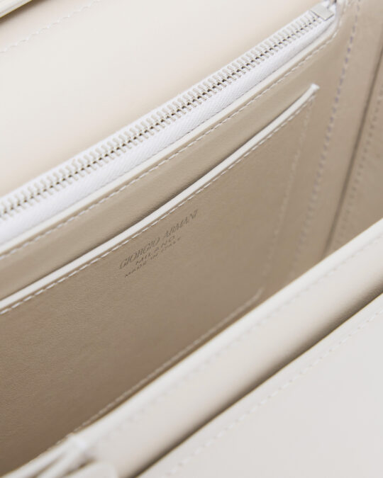La propuesta, que presenta líneas esenciales y compactas con costuras visibles y dos elementos distintivos –una solapa frontal inspirada en la solapa de las chaquetas Armani y un cierre metálico grabado– se define como una continuidad del diseño presentado en la colección de calzado del año pasado. Porque si algo tiene Giorgio Armani en su ADN es esa preciosa inercia por dar continuidad a todas sus creaciones. La atemporalidad es un requisito intrínseco en cada colección y en esta ocasión no iba a ser menos. Como la versatilidad de esta propuesta, concebida como el elemento central del diseño para que el bolso se adapte tanto para las necesidades del día como las apetencias de la noche, transformándose de bolso cruzado a bolso de hombro y de mano.