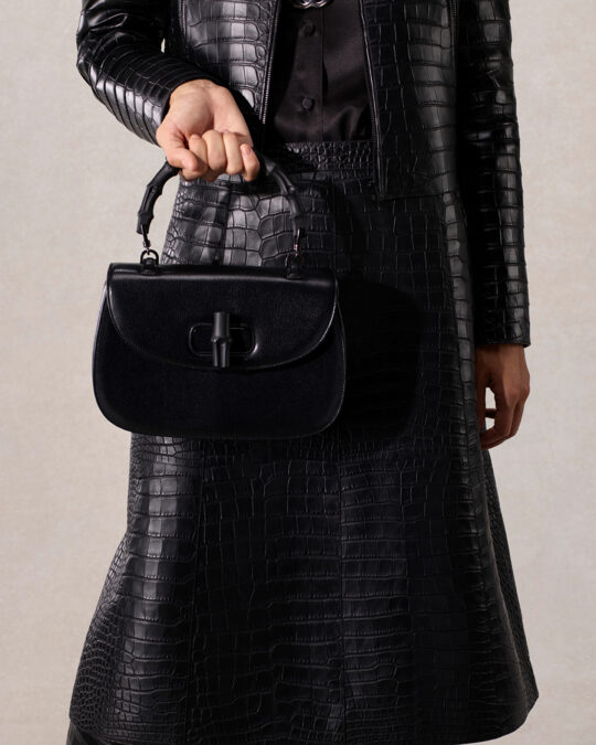 La colección se despliega a través de un espectro de personajes cuyos armarios reinterpretan estos códigos con una nueva sensualidad, espontaneidad y actitud italiana. Incazzata aparece con su vibrante “pequeño abrigo rojo” de estilo años 60, que refleja su temperamento fogoso. Gallerista se mueve por el mundo con un refinado look negro, complementado por el bolso Bamboo 1947 reproporcionado.