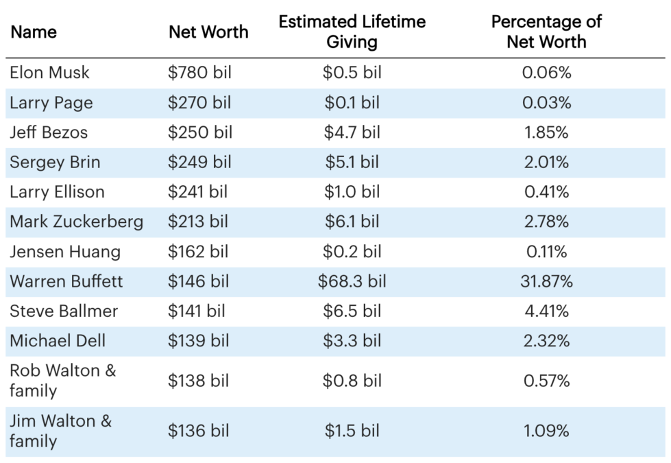 No son lo suficientemente generosos como para estar entre los 25 primeros: Elon Musk y Larry Page, las dos personas más ricas del mundo, que juntos valen más de un billón de dólares.