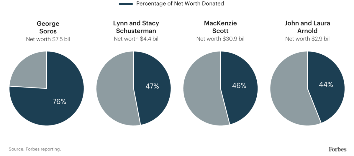 Nadie ha donado más dinero tan rápido como Scott. En menos de siete años, Scott, quien ha vendido más del 75% de las acciones de Amazon que recibió de Bezos, ha donado $26.4 mil millones a más de 2,500 grupos. Solo Warren Buffett, Bill Gates y Melinda French Gates han donado más, pero en ambos casos durante un período mucho más largo. Scott también es uno de solo cuatro de los 25 principales filántropos del país que han donado el 40% o más de sus fortunas. En total, 17 de los 25 principales donantes han donado al menos el 10% de su patrimonio neto, pero solo una de las 12 personas más ricas de Estados Unidos ha alcanzado ese umbral: Warren Buffett, el mayor filántropo de todos los tiempos.