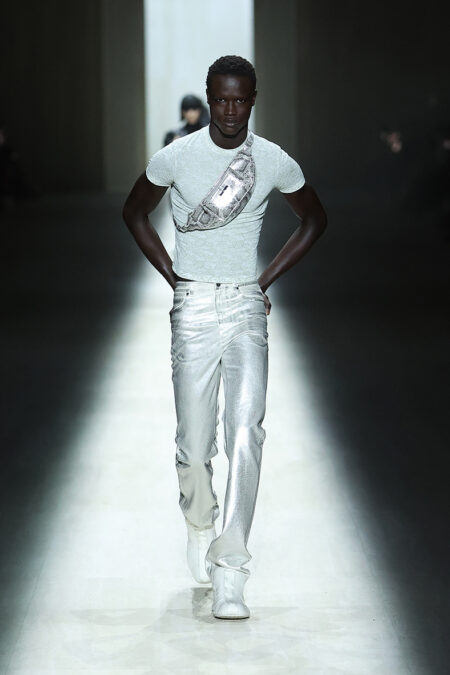 En calzado, la lectura es clara: hibridación. Manhattan, la primera sneaker de Demna para la casa, combina una silueta minimalista de baloncesto con la comodidad slip-on de un mocasín. Los mocasines suaves Giovanni y Cupertino eliminan la estructura dura tradicional del cuero.