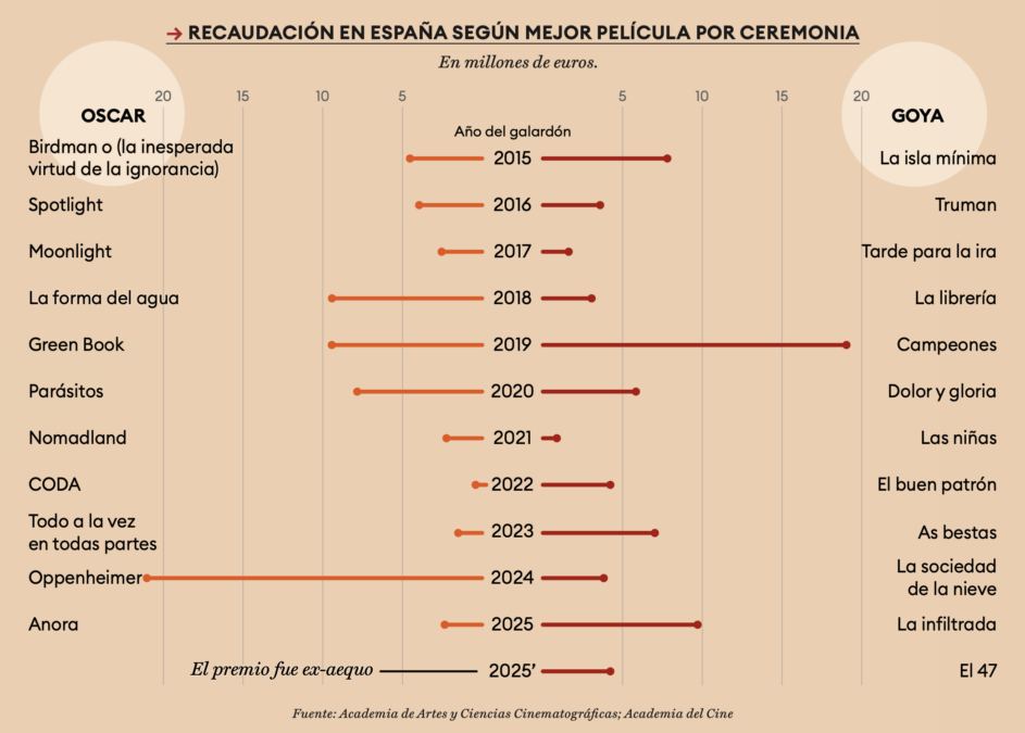 En España, las obras galardonadas como la mejor película en cada ceremonia suelen estar en una horquilla de entre 600.000 y 10 millones de euros en cines, salvo alguna excepción. Oppenheimer, ganadora del Oscar en 2023, superó los 20 millones de euros de recaudación, mientras que Campeones, ganadora del Goya en 2019, rozó también esa cifra. La media de recaudación para las películas internacionales en los últimos 10 años es de 3,9 millones de euros. Para las nacionales, 4,2.