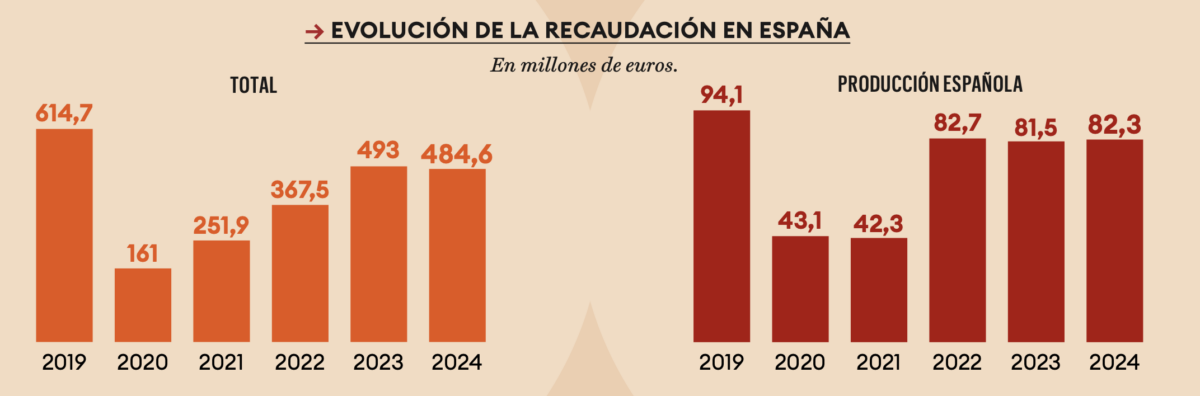 En 2019, las películas internacionales ingresaron 614 millones de euros frente a los 94 millones de las producciones con participación española. En 2024, esa cifra se ha situado en 484 millones de euros para el cine internacional y en 82 millones para el español.