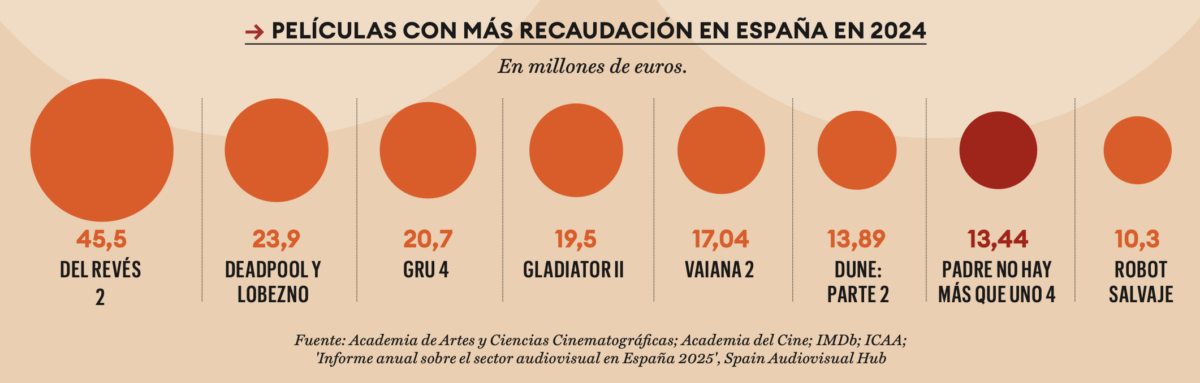 Ese desequilibrio también se ve en las películas más vistas de 2024. Del Revés 2 ha liderado la clasificación con 45 millones de euros ingresados en España. De los 8 títulos con más recaudación, solo uno es español: Padre no hay más que uno 4, que recaudó 13 millones de euros.