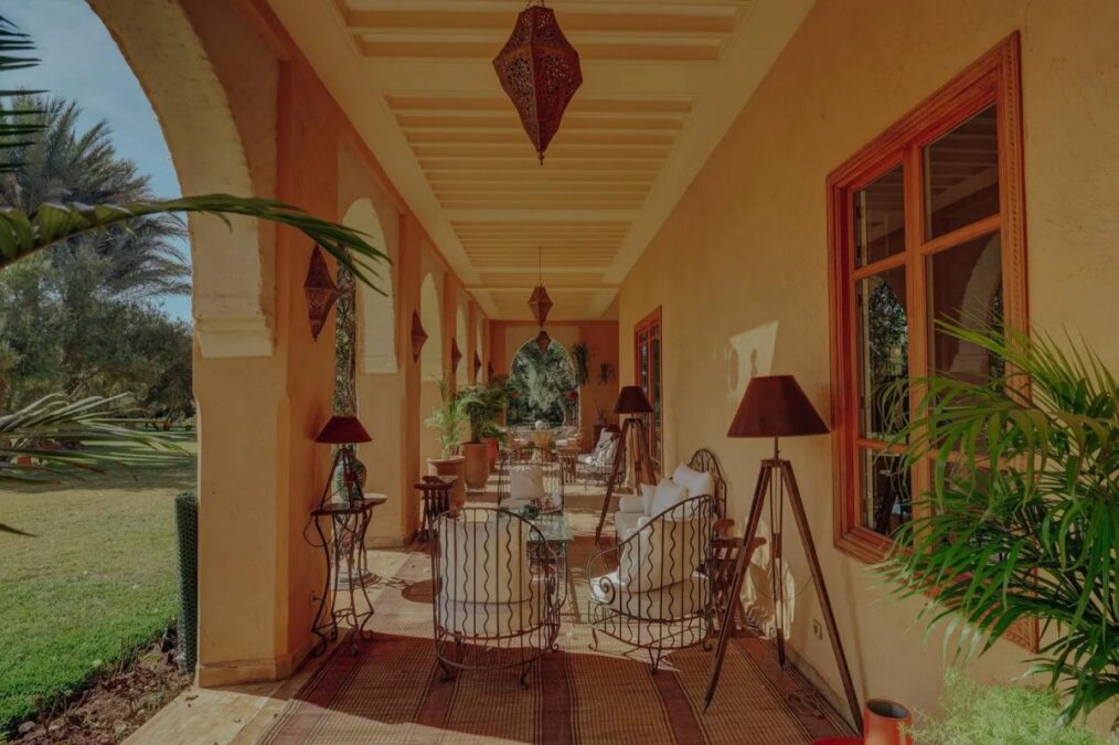 En la planta baja, la Suite Ocre destaca por su sensualidad, impregnada de tapices orientales color rubí, iluminación tenue y mobiliario marroquí de estilo bereber. Las puertas francesas se abren al pórtico con arcadas en tonos ocre, repleto de muebles de mimbre y vegetación en cascada. Más allá se encuentra un paraíso de tres hectáreas con olivos plateados, exuberantes palmeras Washingtonia y césped donde los pavos reales pasean libremente. Al otro lado del jardín, una piscina y un elegante pabellón están rodeados de árboles.