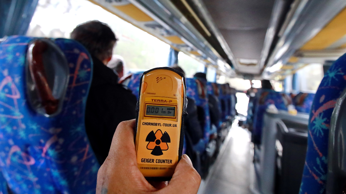 Una persona sostiene un dosímetro de radiación en una visita guiada a Chernóbil. (Getty Images)