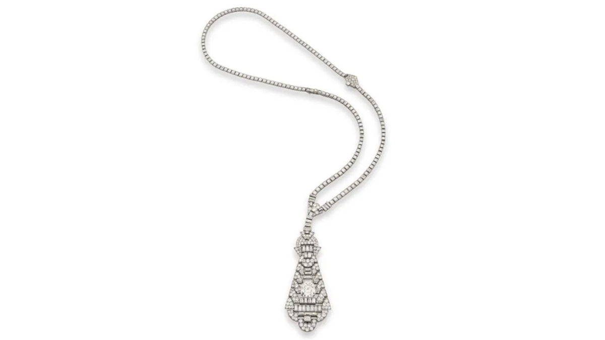 • Un collar largo Art Déco de Van Cleef & Arpels de la década de 1920, con un diamante de talla escalonada de 10,79 quilates, que se vendió por 416.433 dólares.