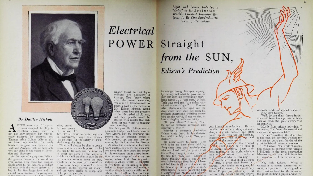 Thomas Edison encabezó la lista de los 250 mayores innovadores históricos de Estados Unidos. Para conmemorarlo, se presenta una entrevista publicada en nuestra edición del 15 de junio de 1929, en la que predijo la energía solar y los trenes eléctricos.