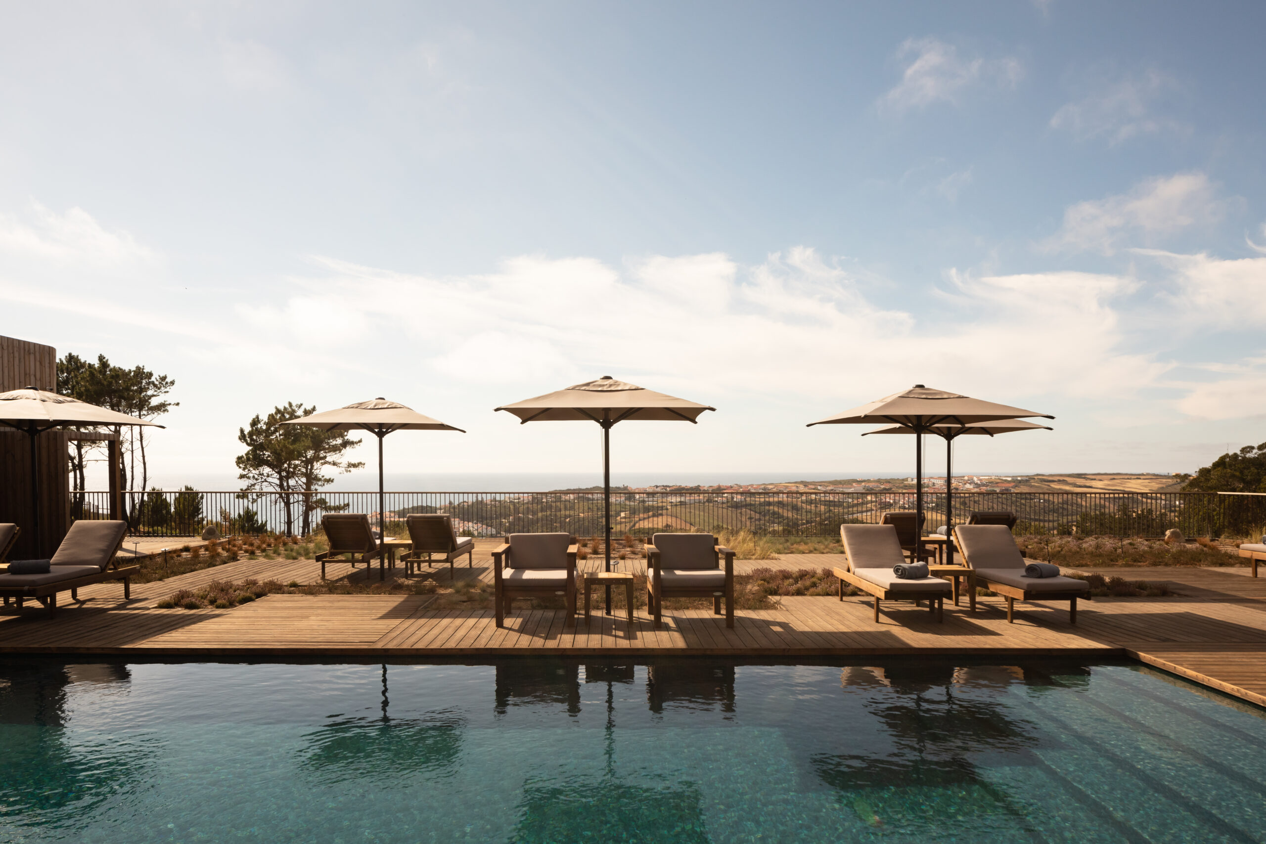 A primera vista, Immerso sorprende por su integración en el valle verde que domina la costa. La arquitectura y el interiorismo buscan evocar el entorno natural, con líneas orgánicas, materiales locales y grandes ventanales que enmarcan el Atlántico. El hotel fue concebido como una extensión de la naturaleza del lugar, un sitio para respirar, detenerse y recuperar el ritmo de la vida lejos de los bullicios urbanos.