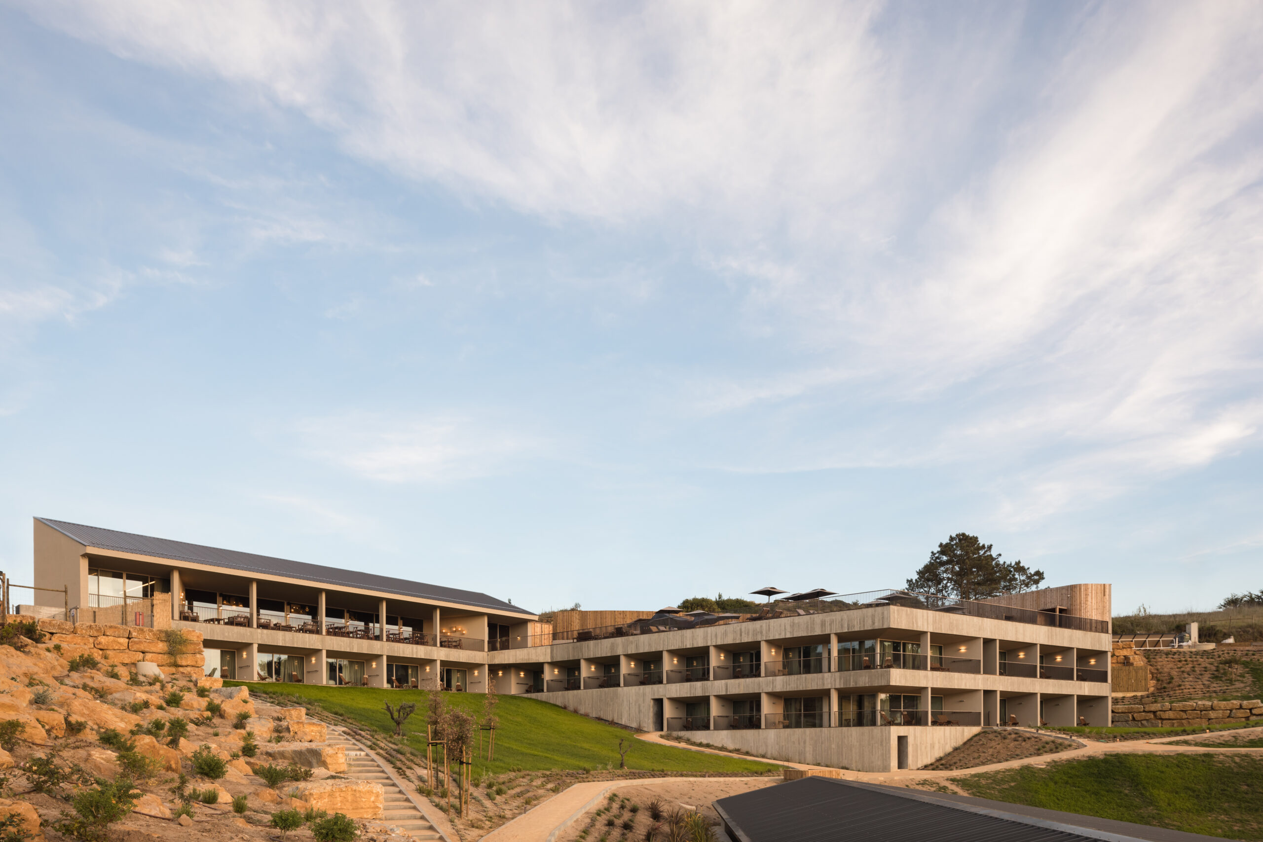 Este enfoque slow se siente desde el momento de llegada: el acceso discurre por colinas verdes, y la sensación general es de aislamiento elegante; aunque la costa y los puntos de interés de Ericeira están a pocos minutos en coche o en el servicio de traslado que ofrece el hotel.