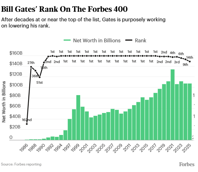 El declive de Gates en la lista de multimillonarios estadounidenses comenzó el año en que él y Melinda French Gates, su esposa durante 27 años, se divorciaron. Cayó al cuarto puesto en la lista Forbes 400 de 2021, con una fortuna estimada en 134 000 millones de dólares. Hace un año, descendió al noveno puesto, con una fortuna de 107 000 millones de dólares. El descenso de su patrimonio neto se produjo tras la renuncia de French Gates como copresidenta de la Fundación Gates y el anuncio de que, como parte de su salida, recibiría 12 500 millones de dólares para su propia filantropía. Al parecer, esos fondos se transfirieron de la fortuna de Bill Gates. Forbes estima ahora que, además del dinero filantrópico, French Gates recibió activos por un valor actual de 29 000 millones de dólares como parte del acuerdo de divorcio. Portavoces de Gates y French Gates se han negado a hacer comentarios sobre el acuerdo.