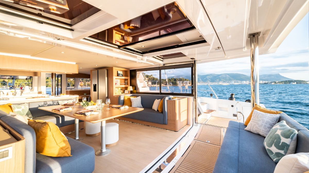 El interior, diseñado por Piaton-Bercault, combina estética, funcionalidad y ergonomía. El salón cuenta con un gran banco en L y mesa XXL para 12 personas, junto a un relajante banco lounge, mientras que la cocina en U y la gran nevera doble ofrecen comodidad y practicidad.