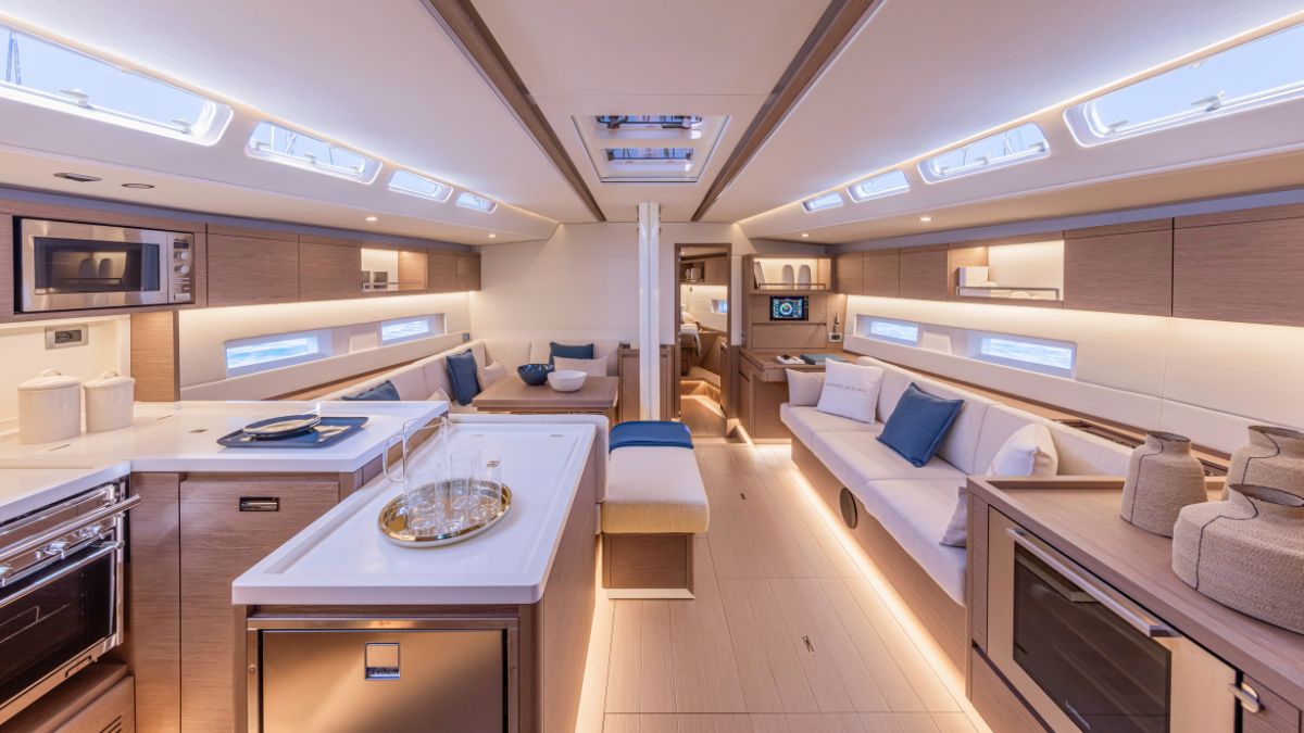 Construido en sandwich ligero de madera, contrachapado marino y espuma PVC, el Grand Soleil 52 Performance ofrece interiores amplios y elegantes. En ellos destacan sus tres cabinas: la del armador en proa con baño privado, el camarote VIP en popa con acceso directo a baño, y una tercera cabina para invitados con cama doble.
