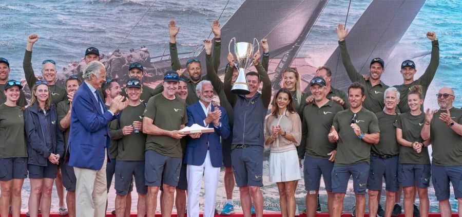Karel Komárek (en el centro, con el trofeo) celebra una victoria con la tripulación de su equipo «Wally Cento V». Foto: Tre Golfi Sailing Week | Studio Borlenghi