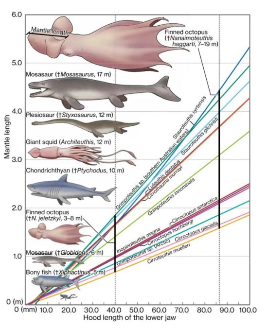 Diagrama comparativo que muestra las diferencias de tamaño entre los principales depredadores marinos del Cretácico y el pulpo gigante Nanaimoteuthis haggarti. Imagen: Ikegami et al. / Universidad de Hokkaido.