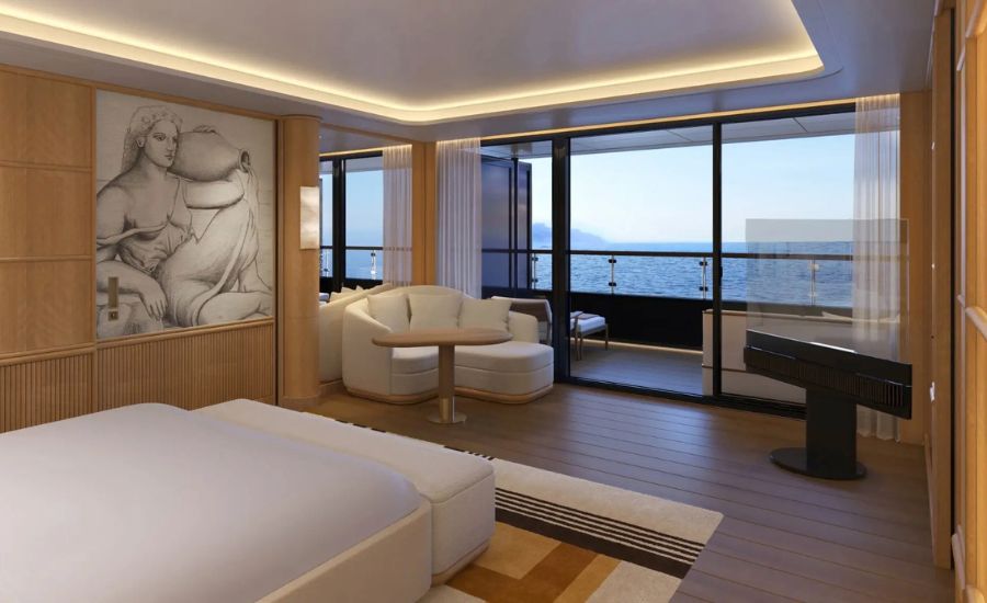 En su interior destaca la espectacular Funnel Suite, una de las mayores suites en el mar, con más de 900 m² de espacio total y una piscina privada integrada en su terraza.