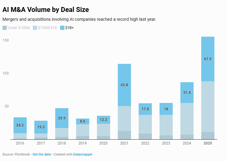 Su estrategia fue oportuna. El año pasado fue un año récord para las fusiones y adquisiciones en el sector de la IA, alcanzando más de 1600 operaciones por un valor declarado de 155 000 millones de dólares, según datos de Pitchbook. Aún más importante para Axom, a pesar de las megaoperaciones que acapararon titulares el año pasado —como la adquisición de Wiz por parte de Google por 32 000 millones de dólares y la de Scale AI por parte de Meta por 14 800 millones de dólares—, la mayor parte del volumen sigue estando en operaciones que oscilan entre los 100 millones y los 1000 millones de dólares, el segmento al que apunta Axom. El volumen de operaciones en este segmento de «mercado medio» representó el 49 % del volumen total de fusiones y adquisiciones en el sector de la IA en 2025, con alrededor de 77 000 millones de dólares, según Pitchbook.