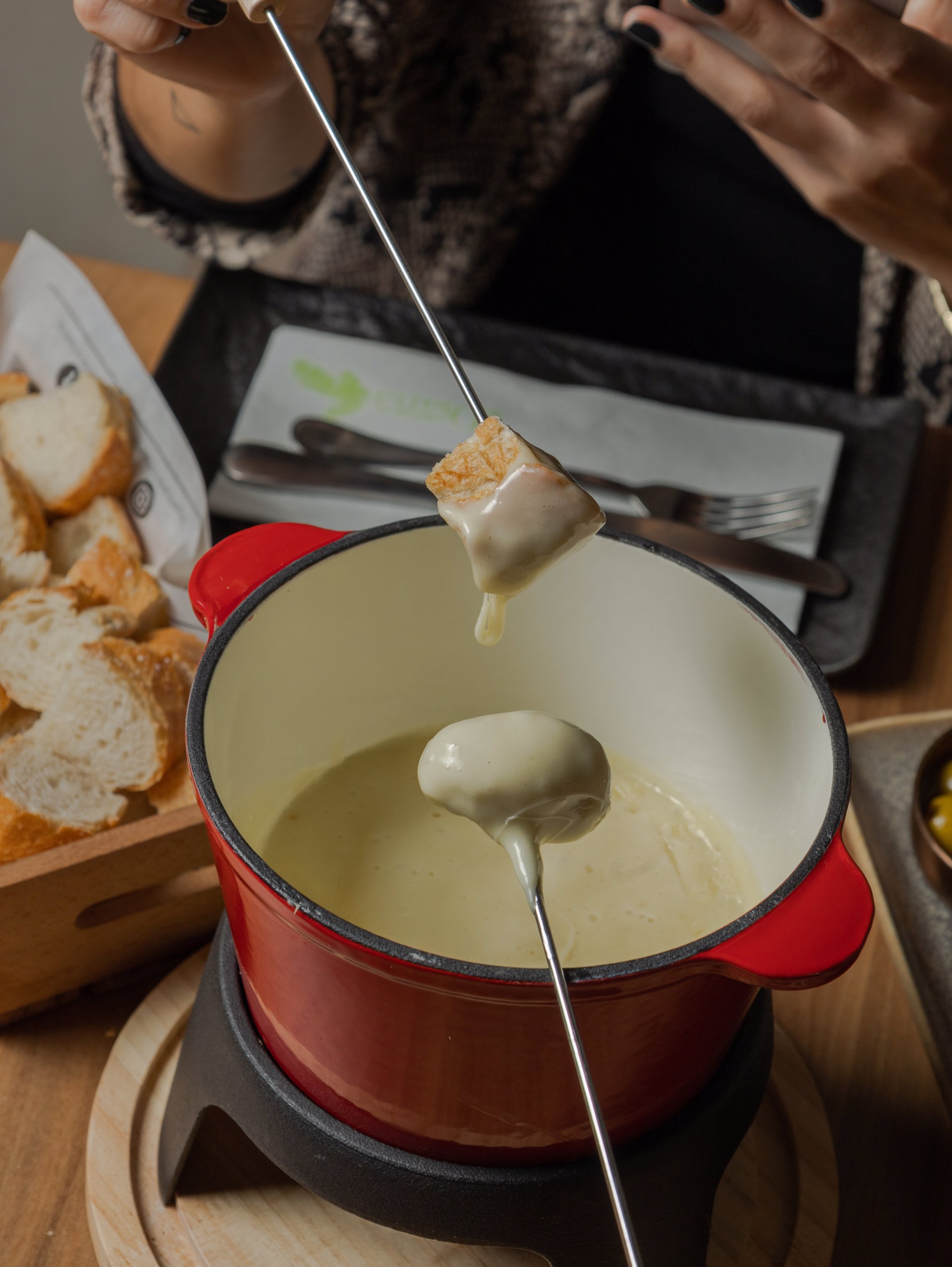 A continuación, los protagonistas imbatibles del Día del Queso: las fondues. Imposible pensar en queso y no imaginar estas cremosas delicias. Una mezcla sedosa de queso suizo fundido, realzada con un toque de licor de cereza y la profundidad del vino blanco, invita a sumergirse en una experiencia cálida y envolvente. Acompañada de patatas baby, pan de baguette crujiente, encurtidos y fuet.