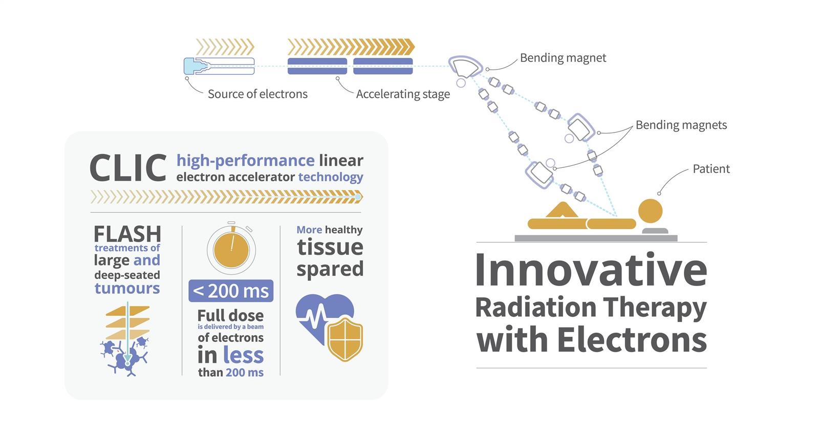 El CERN ha respondido al reto de producir una alta dosis de electrones de muy alta energía en menos de 100 milisegundos, necesaria para la radioterapia FLASH, diseñando un acelerador único basado en la tecnología CLIC (Compact Linear Collider). Se acelerarán los electrones para tratar tumores de hasta 20 cm de profundidad y será lo suficientemente compacto como para caber en un campus hospitalario convencional.