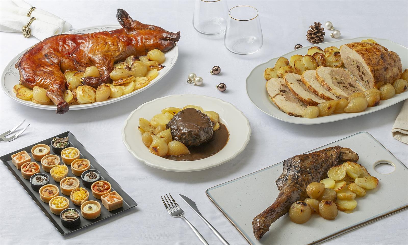Como platos principales, la oferta incluye pollo de corral deshuesado relleno de chalotas, trufa, foie, ciruelas, brandy y tocino; medio cochinillo asado; paletilla de cordero lechal marinada con sal, romero, tomillo y limón, o la carrillada guisada con salsa de carne y vino tinto. Todos los productos son servidos con guarnición de patatas panaderas y cebollas confitadas.