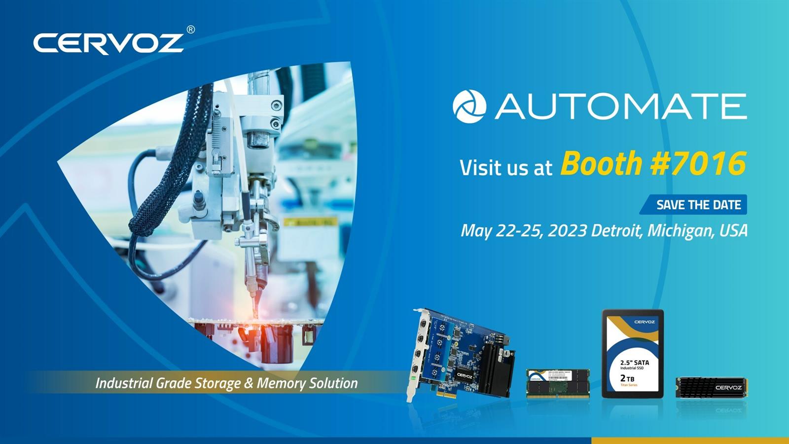 TAIPEI, 1 de mayo de 2023/PRNewswire/ — Prepárese para sorprenderse cuando Cervoz, el proveedor pionero de soluciones de almacenamiento y memoria industrial, fija su mirada en el muy esperado Automate Show 2023 en Detroit, Estados Unidos, del 22 al 25 de mayo. Cervoz presentará sus últimas tecnologías de vanguardia y productos innovadores. diseñado específicamente para satisfacer las demandas únicas de la industria de la automatización.