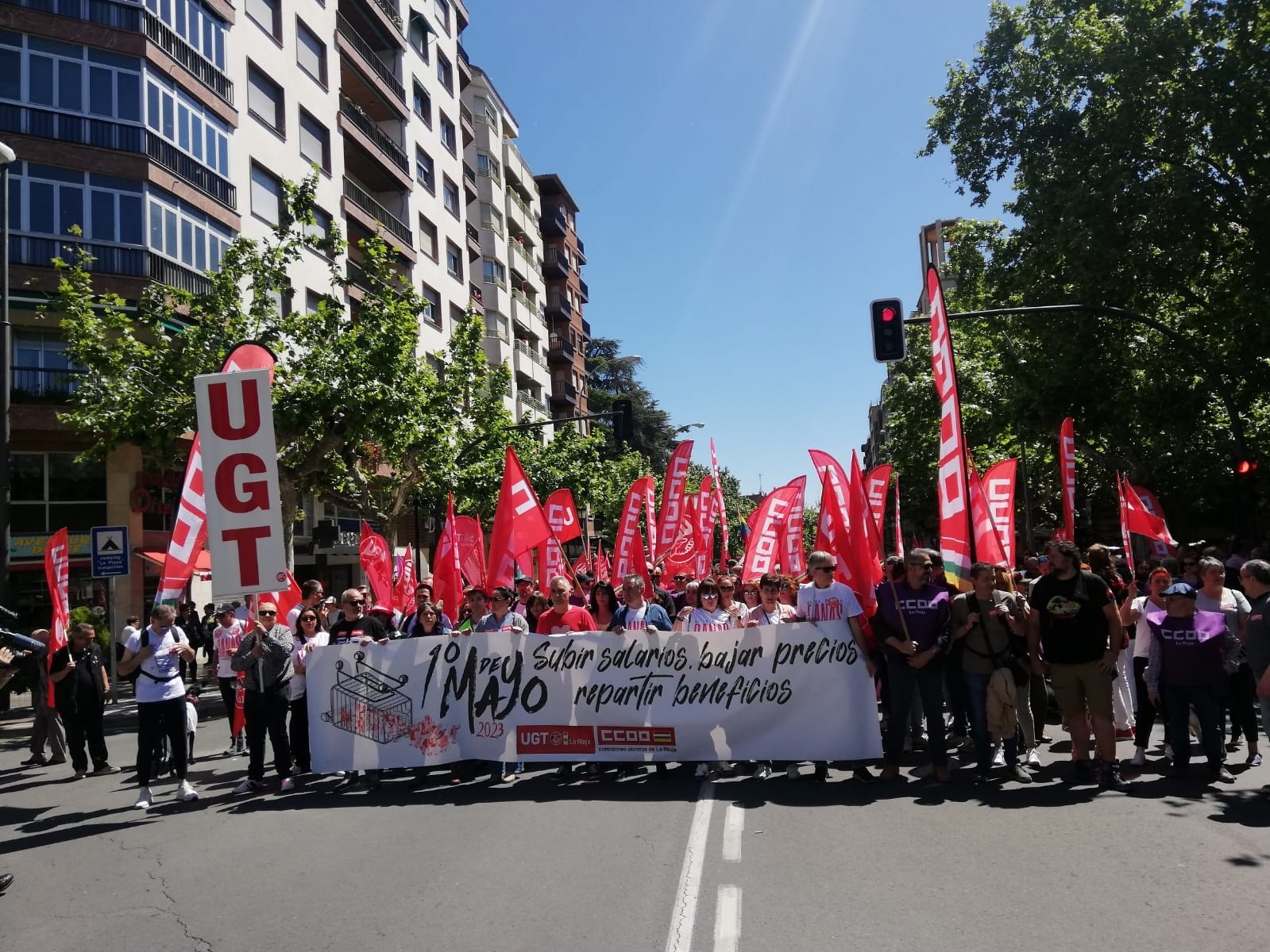 Como ha señalado a los medios de comunicación momentos antes de abrir la marcha el secretario general de UGT de La Rioja, Jesús Izquierdo, «volvemos a salir a la calle, este año bajo el lema ‘Subir salarios, bajar precios, reducir beneficios’, porque esos son nuestros objetivos para los próximos meses».