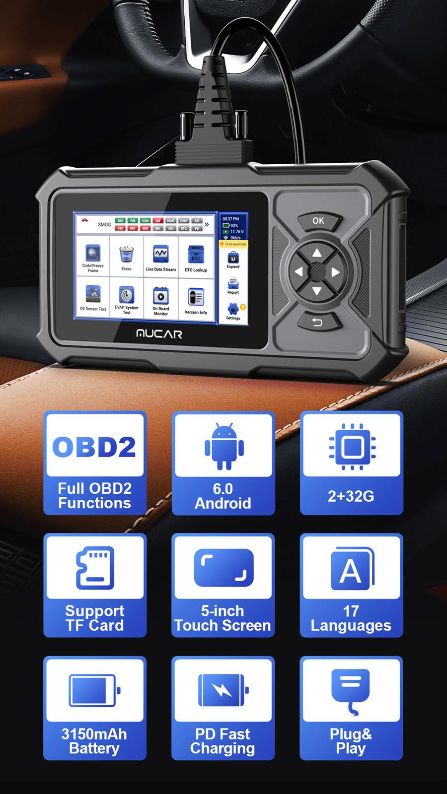 El MUCAR CDE900 PRO está equipado con una pantalla táctil de 5 pulgadas y un cable de diagnóstico de 1,2 m. El MUCAR CDE900 PRO ofrece una interfaz fácil de usar que facilita el diagnóstico del coche. Equipado con Android 6.0 y un chip Cortex MT6580 de 4 núcleos, ofrece velocidades de procesamiento ultrarrápidas, lo que permite a los usuarios identificar y solucionar cualquier problema con sus coches de forma rápida y sencilla.