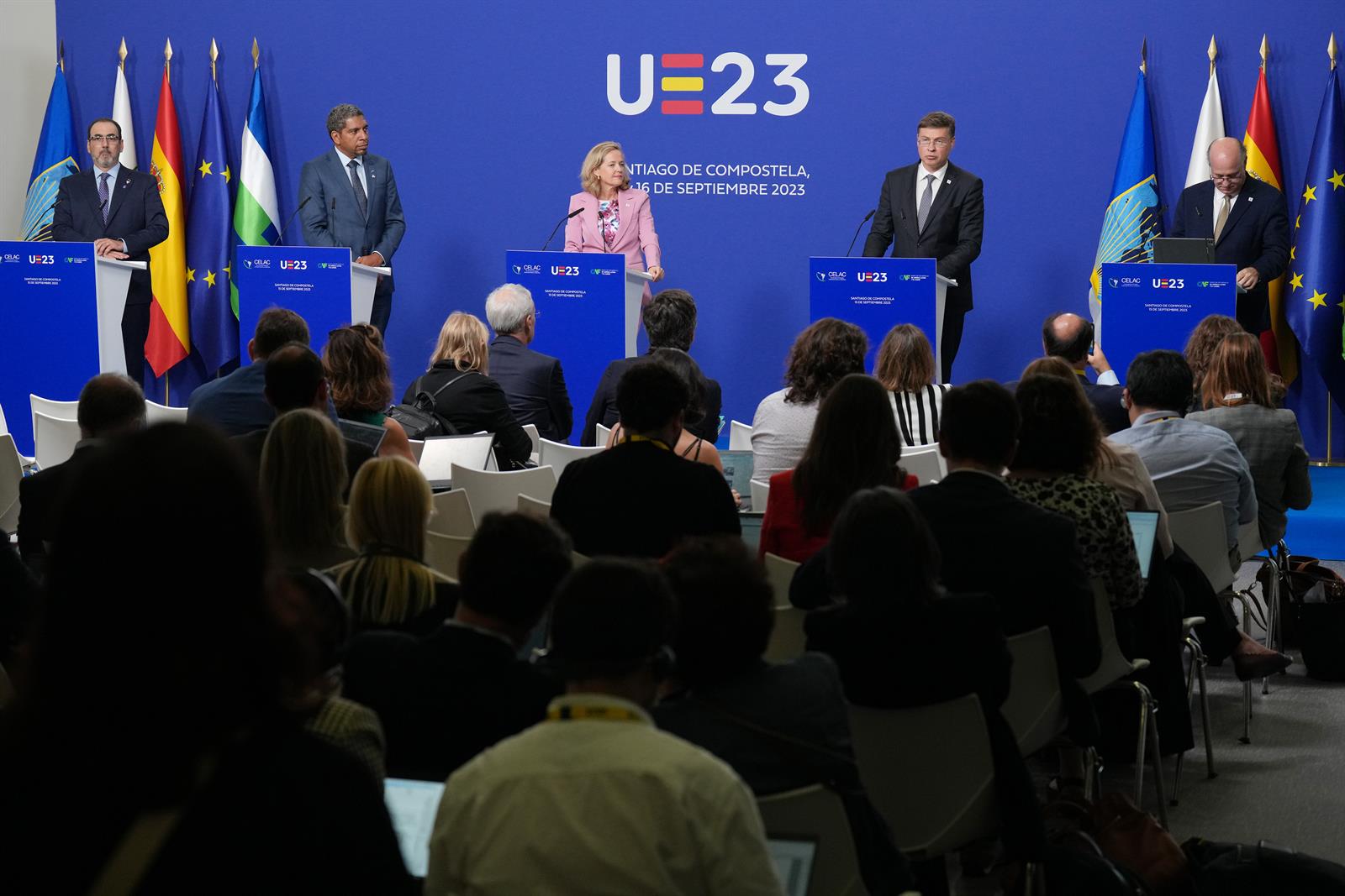 La vicepresidenta primera del Gobierno y ministra de Asuntos Económicos y Transformación Digital en funciones, Nadia Calviño, ha destacado que la reunión del Ecofin celebrada este viernes en Santiago de Compostela entre los ministros de la Unión Europea y la Comunidad de Estados Latinoamericanos y Caribeños (CELAC) es la primera piedra «para construir esa capilla que resultará en una catedral y que servirá para afianzar el crecimiento sostenible, justo y un mundo mejor para generaciones venideras».
